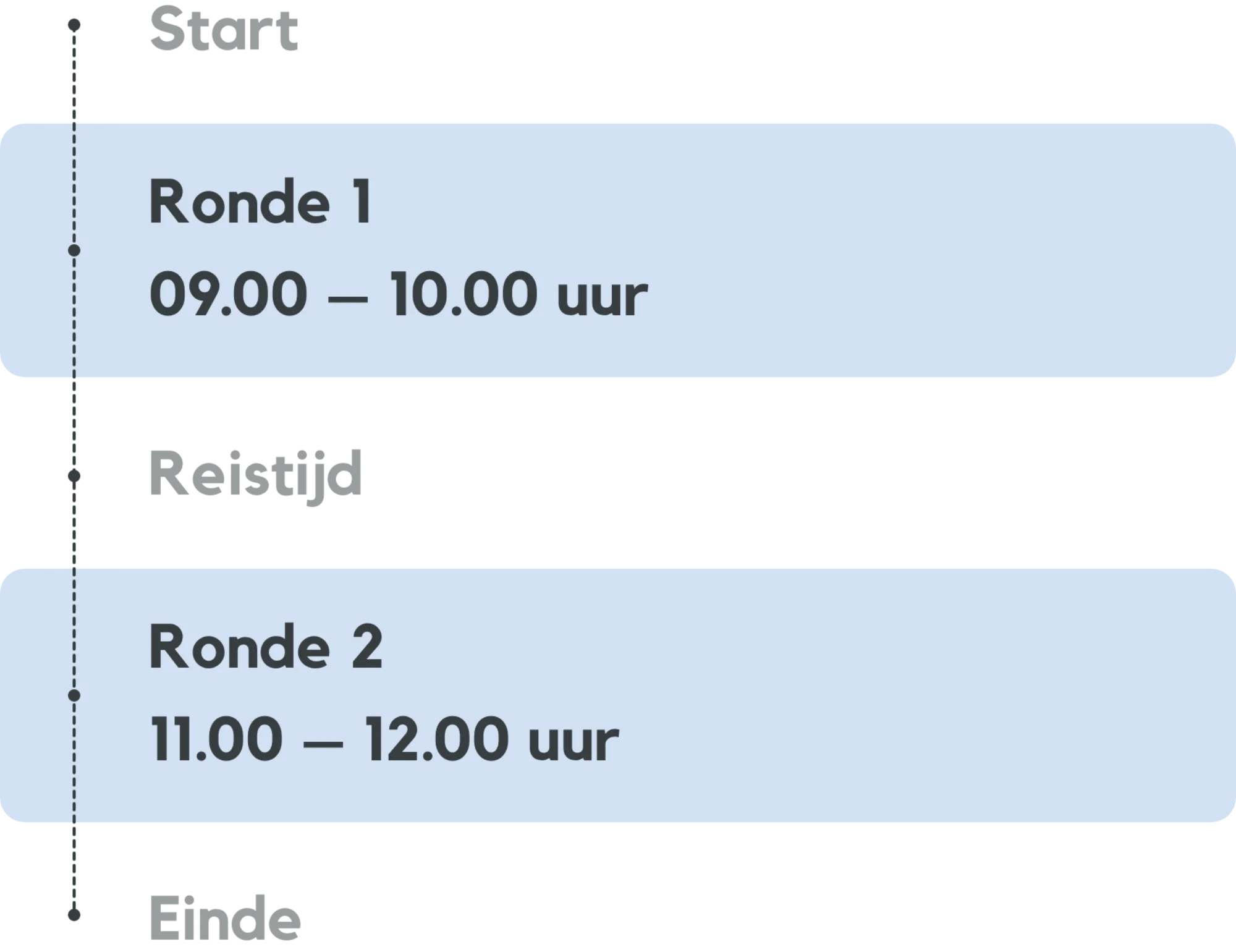 De ochtend bestaat uit twee rondes. Elke ronde duurt ongeveer één uur: ronde 1 van 09.00 – 10.00 uur en ronde 2 van 11.00 – 12.00 uur. Tussen de rondes is er tijd om te reizen en te wisselen.